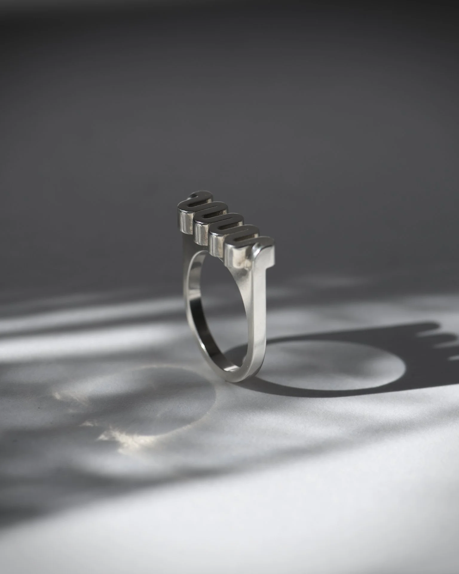 An exploration of soft volumes and brutalist aesthetics. Crafted in sterling silver with a matte, sandblasted finish that emphasizes its sculptural silhouette. A balanced intersection of weight and playful geometry.